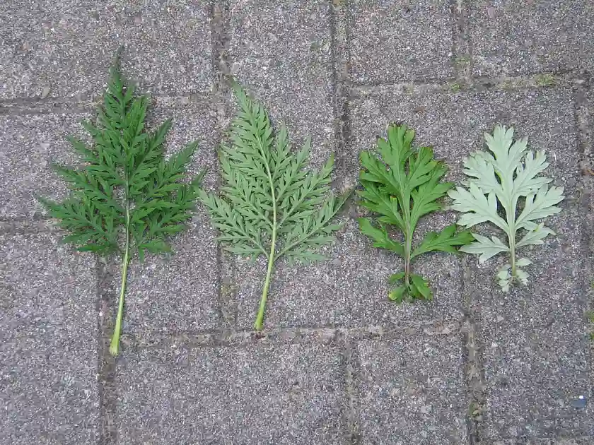 Die einheimische Pflanze, der gemeine Beifuß Artemesia vulgaris, unterscheidet sich durch seine dunkelgrüne Blattoberseite und einer behaarten weiß-filzigen Blattunterseite vom "aufrechten Traubenkraut" Ambrosia artemesiifolie. Das "aufrechte Traubenkraut" hat doppelt fiederteilige Blätter mit einer grünen Blattunterseite . Die Stiele sind im Gegensatz zum Beifuß violett gefärbt - Details siehe unten in der Bildergalerie.